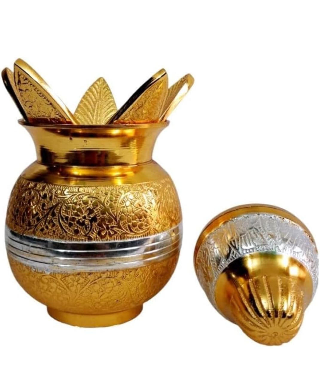 Description: ✔ Material :- 100% Pure Brass | Weight 400 Gram. !! ✔ Color:- Golden & Silver With Long Lasting Polish !! ✔ Product Dimensions:- Kalash - Length 10 x Width 10 x Height 15 Centimeters And Coconut - Lenght10 Centimeter !! ✔ Package Contents:- 1 Kalash, 1 Coconut & 1 Mango Leaf in Velvet Box !!